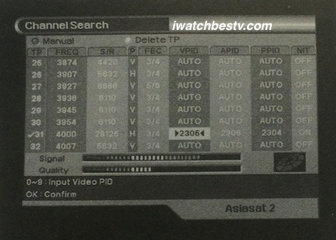 If you did not find a transponder on the predefined transponder list, you can simply add it. Press the UP /DOWN buttons to select the Satellite TP No. you want to find and then press the OK button. Press the Green button for the manual channel search net to appear.